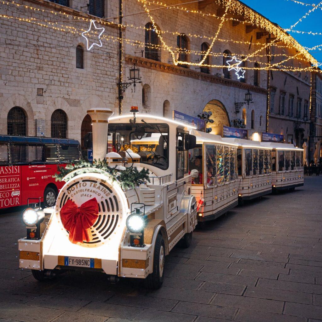 Poi giro panoramico sul trenino di Natale turistico per Assisi, per vedere Assisi “by night” con tutte le luminarie e le proiezioni luminose natalizie;