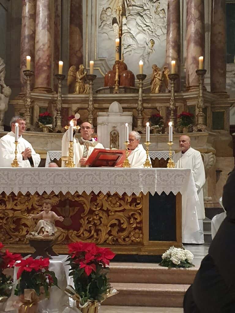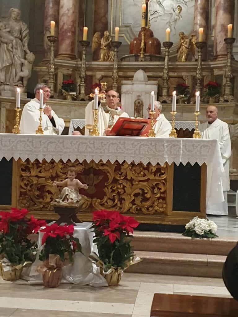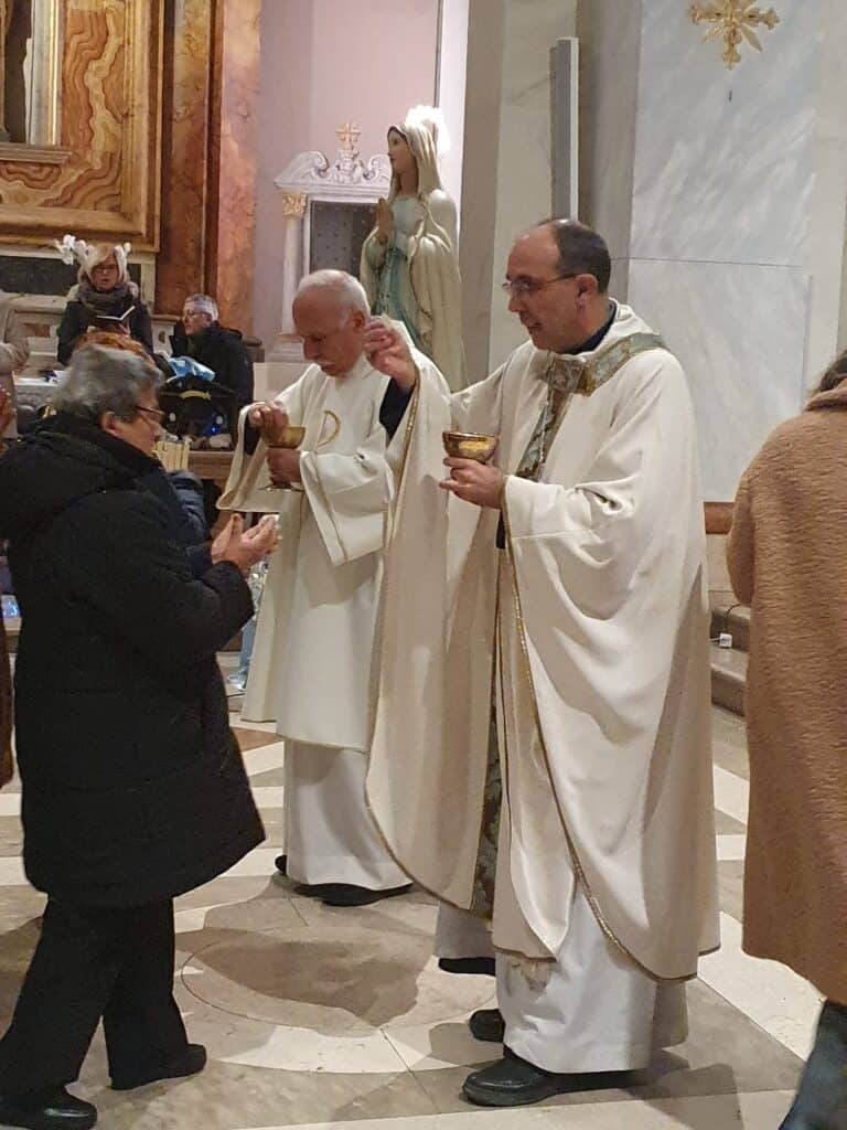 Il pomeriggio era molto freddo, con un vento pungente che soffiava forte. Comunque, la gente ha riempito silenziosamente il Duomo, con la presenza di diversi pitiglianesi e anche molti forestieri e turisti, magari persone di Pitigliano che ormai vivono fuori per vari motivi, ma che, nei giorni di festa e di vacanze, ritornano al proprio paese. La Messa era quella della liturgia della solennità del giorno, Maria Santissima Madre di Dio. Accanto al Vescovo hanno prestato servizio i diaconi Stefano e Carlo, mentre io e Don Lido abbiamo concelebrato, con l’assistenza di un giovane ministrante.
