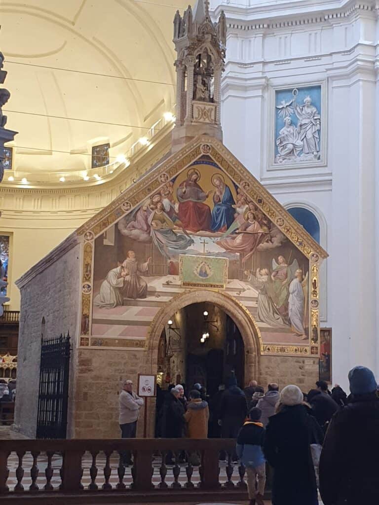 Prima tappa la visita alla Basilica papale di Santa Maria degli Angeli al cui interno, nella sua solenne ed essenziale semplicità, si trova la Porziuncola, la piccola chiesa centro della spiritualità francescana, uno dei luoghi prediletti da Francesco dove spesso amava raccogliersi in preghiera. Entrare in quel luogo, soffermarsi a pregare, sfiorare quelle pareti che tante volte hanno visto la Sua presenza ed ascoltate le Sue parole, dà un profondo senso di pace interiore e genera profonda commozione.